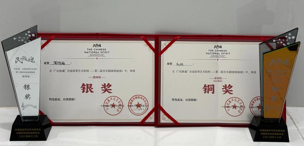 12月7日,由中国民族声乐研究会、广州市文化广电旅游局、中国音乐剧创演委员会联合主办的“民族魂”全国高等艺术院校第二届音乐剧演唱展演于广东粤剧院落下帷幕。我校教师周祥超荣获教师组银奖,由侯惠文老师悉心指导的2023级音乐剧演唱班学生赵硕,以扎实的专业能力与良好的艺术素养荣获本科综合组铜奖。此外,侯惠文老师因指导效果突出,荣获优秀指导教师奖。
